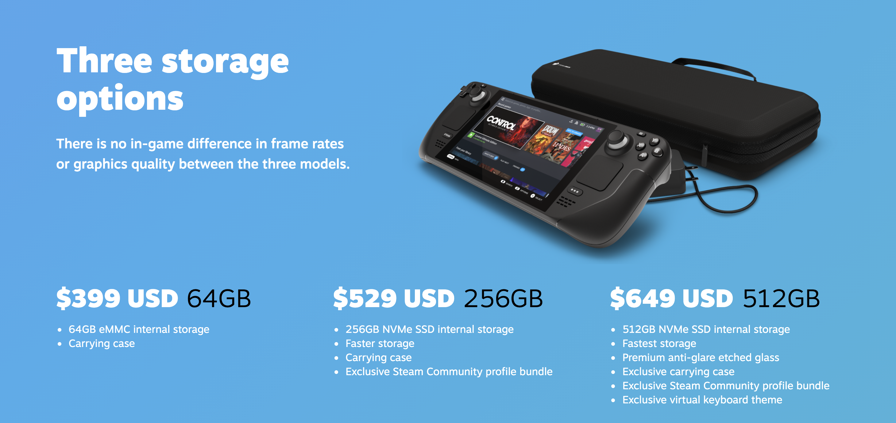 게임기의 가장 중요한 포인트 중에 또다른 하나는 가격입니다. 스팀덱의 가격은 스토리지 용량에 따라 다릅니다. 64GB 모델은 $399로 약 45만원 정도입니다. 256GB 모델은 $529이며, 512GB 모델은 $649입니다.