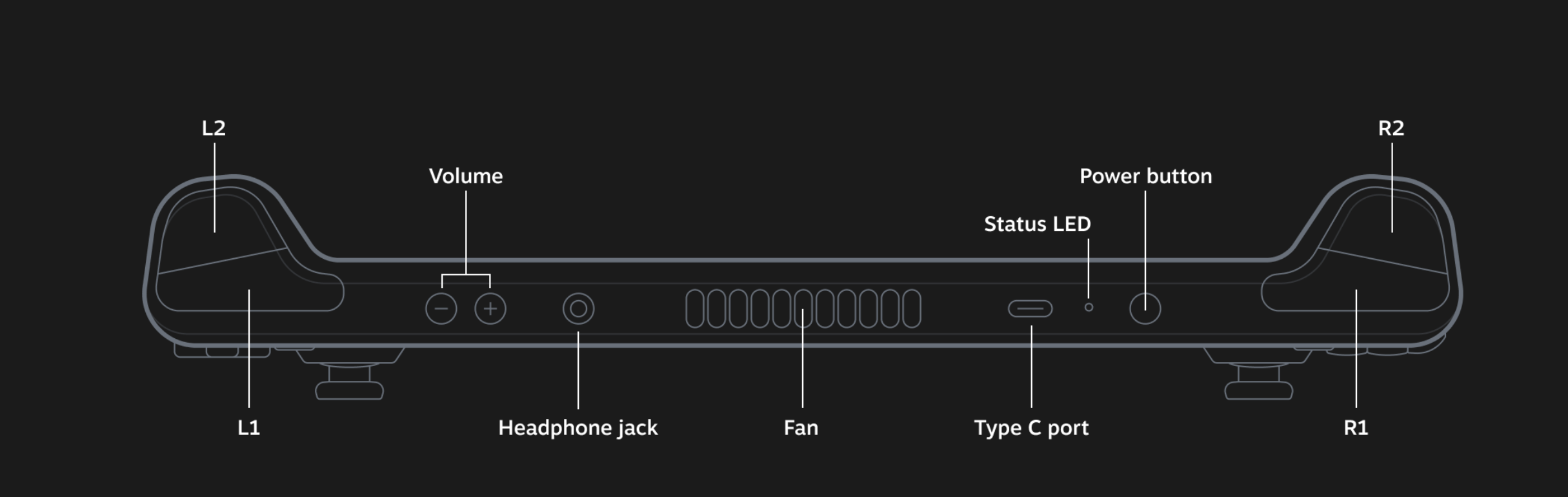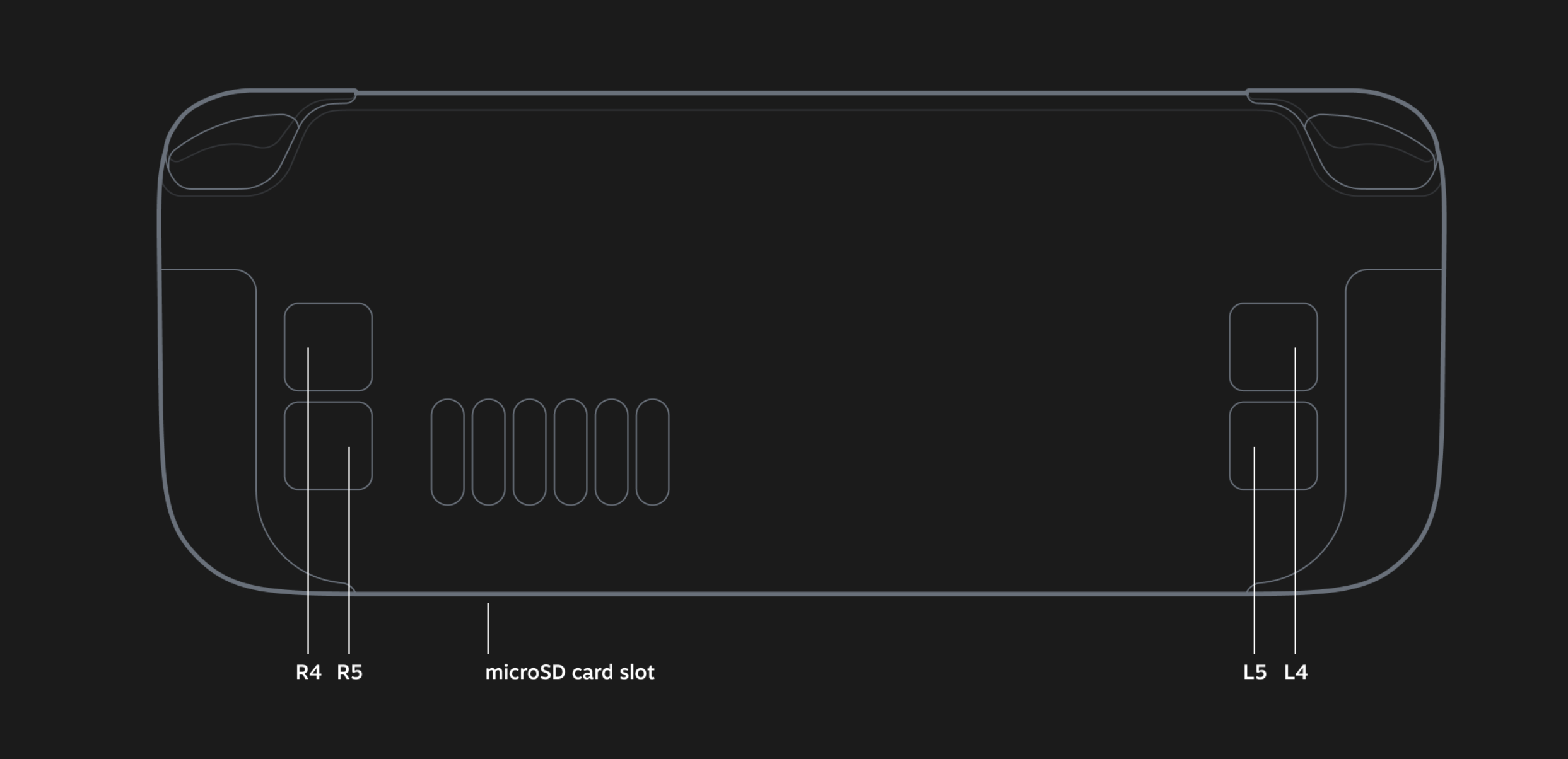 게임기를 잡았을 때, 검지를 이용해서 누를 수 있는 R1, R2, L1, L2 버튼이 스팀 덱 상단에 위치해있습니다. 슈팅게임을 할 때 편할 것 같습니다. 스팀 덱 제품의 후면에는 R4, R5, L4, L5 버튼도 있습니다. 다양한 버튼이 있어서 좀 더 자유로운 조작이 가능할 것으로 보입니다.