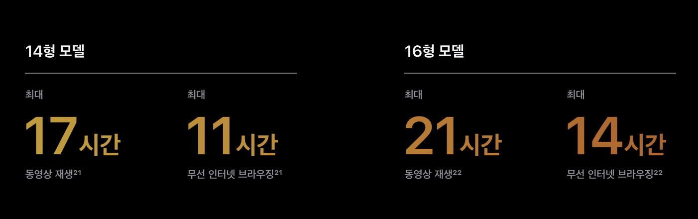 이번 맥북프로는 새로운 CPU를 탑재하면서 놀라운 수준의 배터리 효율을 갖췄습니다. 맥북프로 14 타입의 경우 70Whr 용량이 탑재되어 최대 17시간 동안 영상을 재생할 수 있으며, 16타입의 경우 100Whr 용량의 배터리가 탑재되어 최대 21시간 영상을 재생할 수 있습니다. 두 제품 모두 전작과 비교해서 10시간 가량 배터리 타임이 늘어났습니다.