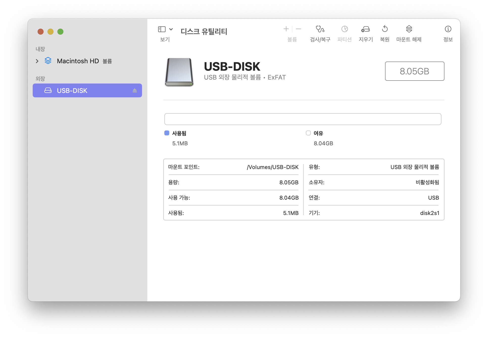 포맷이 완료되었다. 사용됨이라는 항목이 5.1MB로 줄어든 것을 확인할 수 있다. 이 공간은 파일 시스템의 메타 데이터를 저장하기 위한 공간으로 보인다.