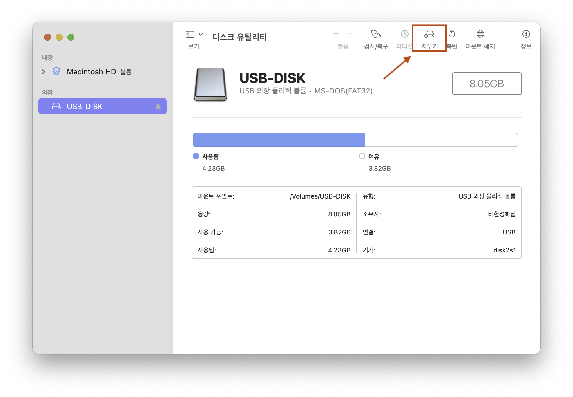 맥북에서도 USB 메모리를 사용한다. 사용하지 않을 USB 메모리는 포맷을 해야하는데, 윈도우의 경우 '내 컴퓨터'를 통해서 바로 USB 메모리를 포맷할 수 있다.