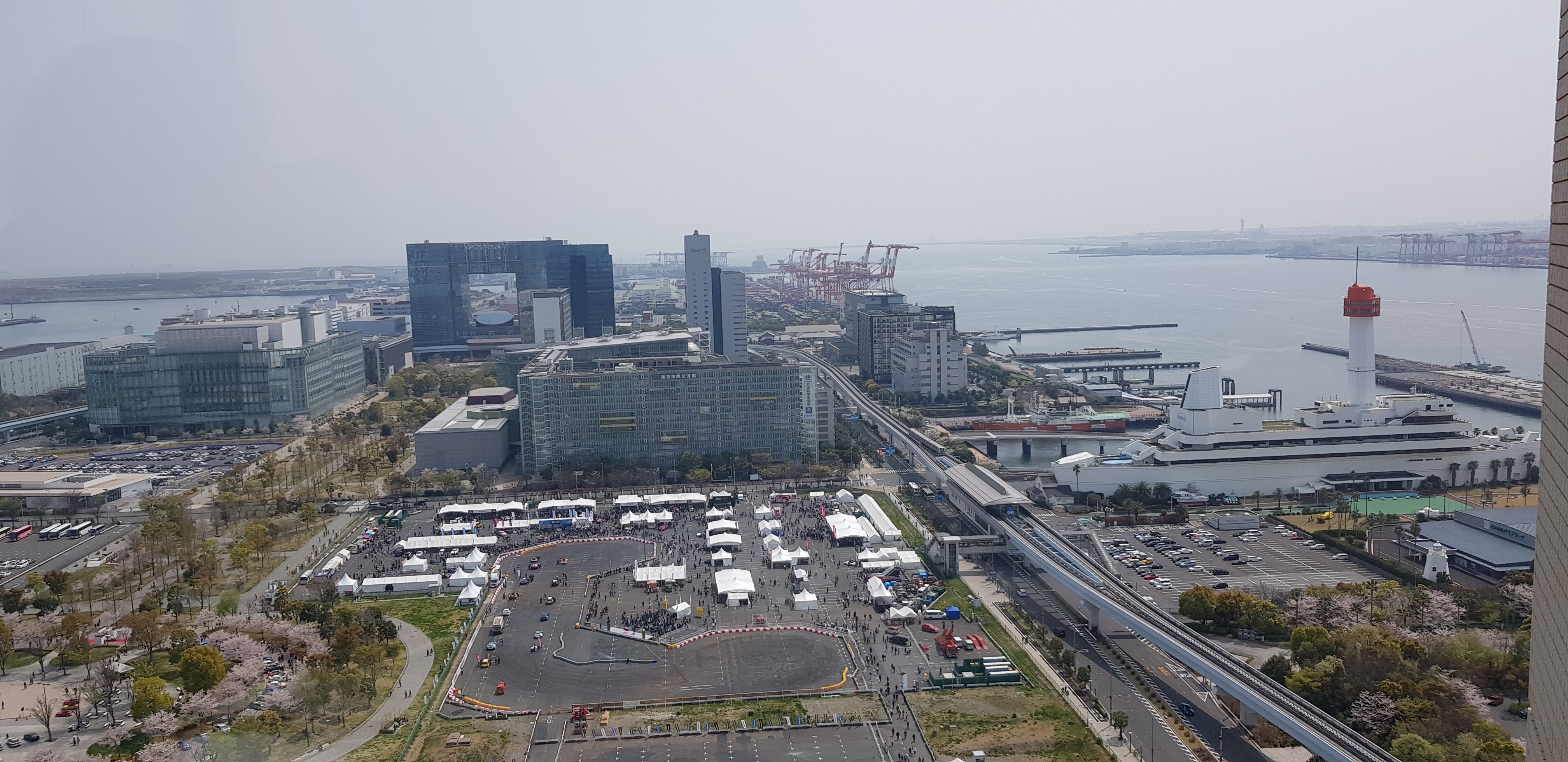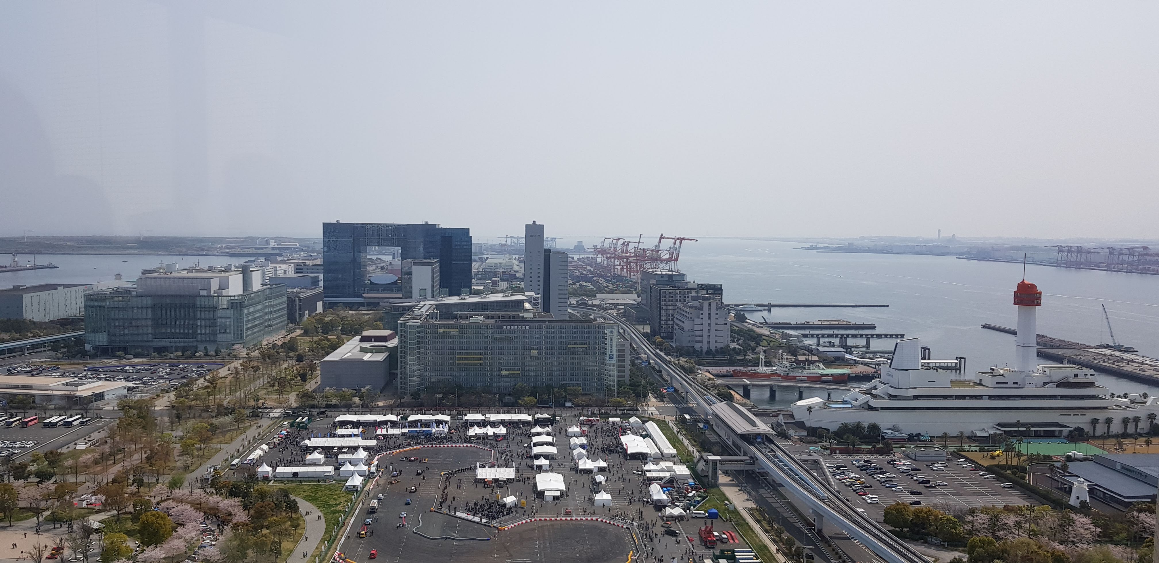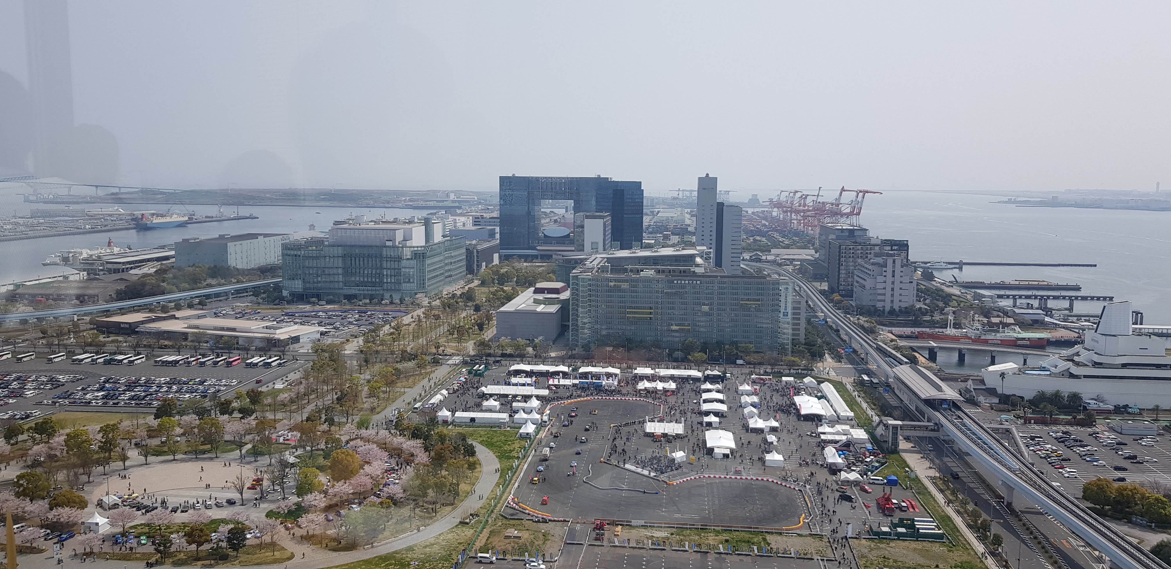그랜드 닛코 오다이바 호텔의 꼭대기에서 바라다 본 웨스트 프롬나드 공원의 전경입니다. 넓은 주차장에서 행사를 하고 있고, 주차장 바닥에는 드리프트의 흔적이 있습니다. 아직도 많은 사람들이 몰려있네요.
