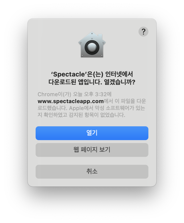 앱 스토어에서 다운로드한 것이 아닌 인터넷에서 다운로드된 앱이라는 것을 알려줍니다. Spectacleapp.com에서 다운로드 했고, 애플이 확인한바로는 악성 소프트웨어는 없다고 확인해줬습니다. '열기'를 눌러 실행합니다.