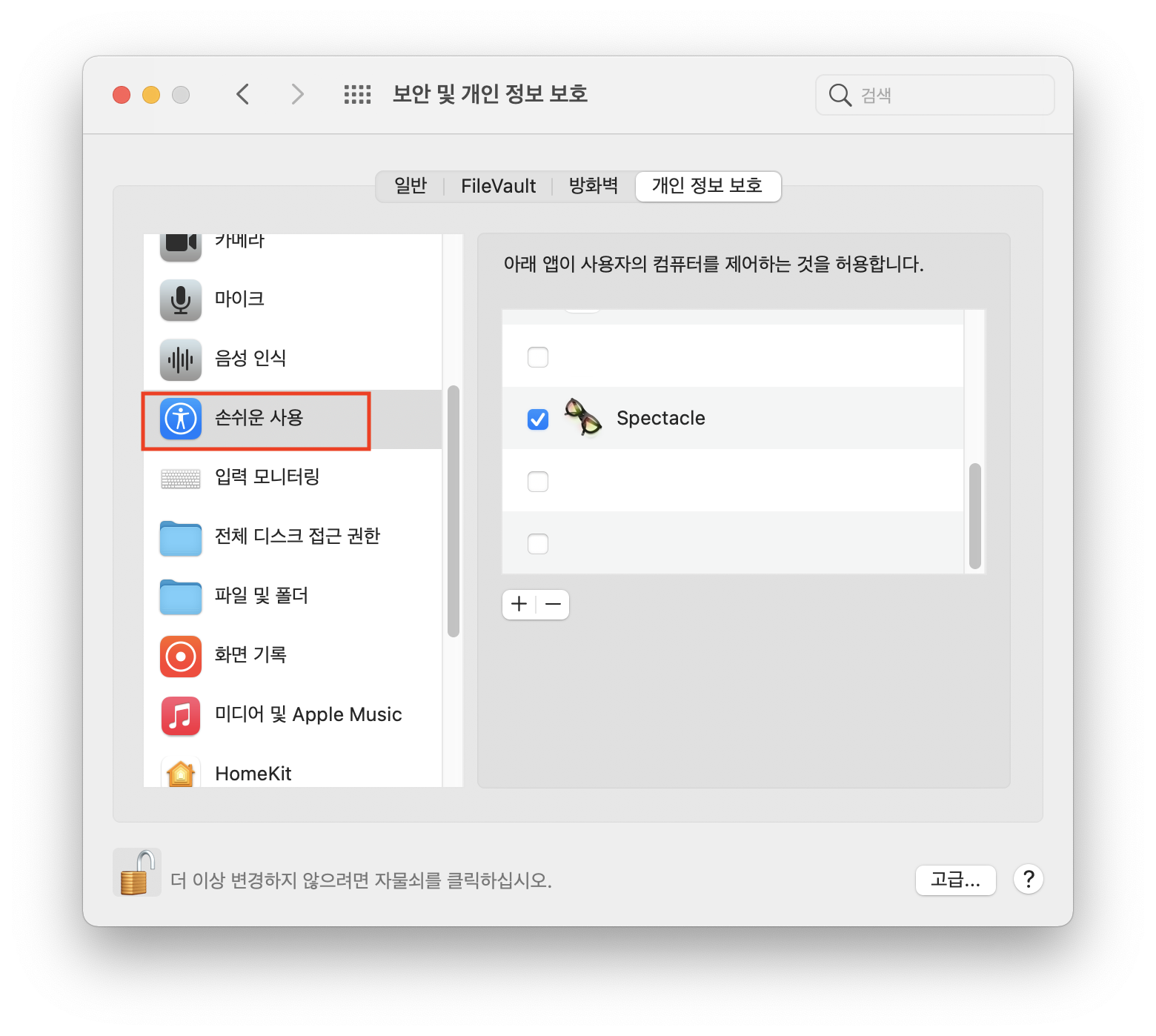 그러면 "아래 앱이 사용자의 컴퓨터를 제어하는 것을 허용합니다" 아래에 앱들을 선택할 수 있도록 활성화 됩니다. 그 중 "Spectacle" 항목을 체크해주고, 자물쇠 버튼을 다시 눌러주면 됩니다.
