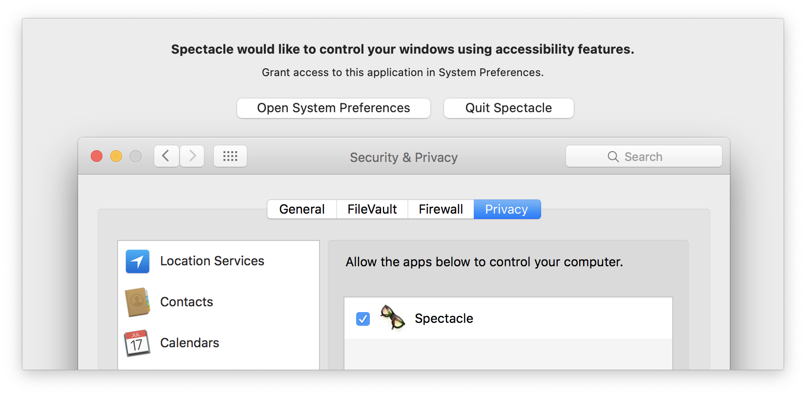Spectacle 앱은 윈도우 시스템과 연동해서 동작하기 때문에 시스템 권한을 줘야합니다. 최초로 실행했을 경우 관련 권한이 없어서 "Spectacle would like to control your windows using accessibility features"라는 안내가 나옵니다.