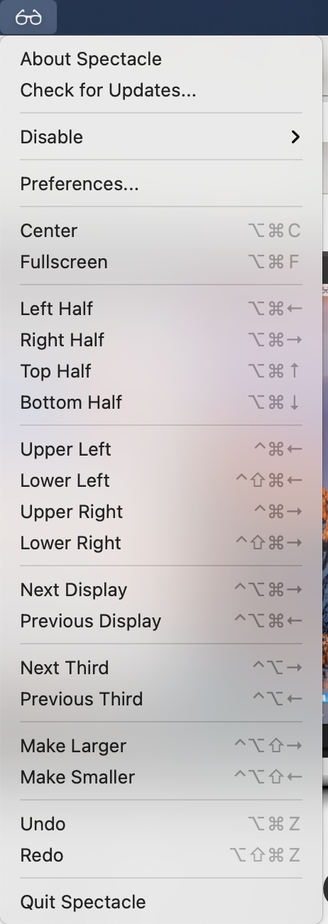 맥의 상태 아이콘 중 썬글라스 모양의 아이콘을 찾아볼 수 있습니다. Spectacle 앱이 실행중인데요. 아이콘을 클릭하면 다시 설정 창을 열수도 있고, 프로그램을 종료할 수도 있습니다.