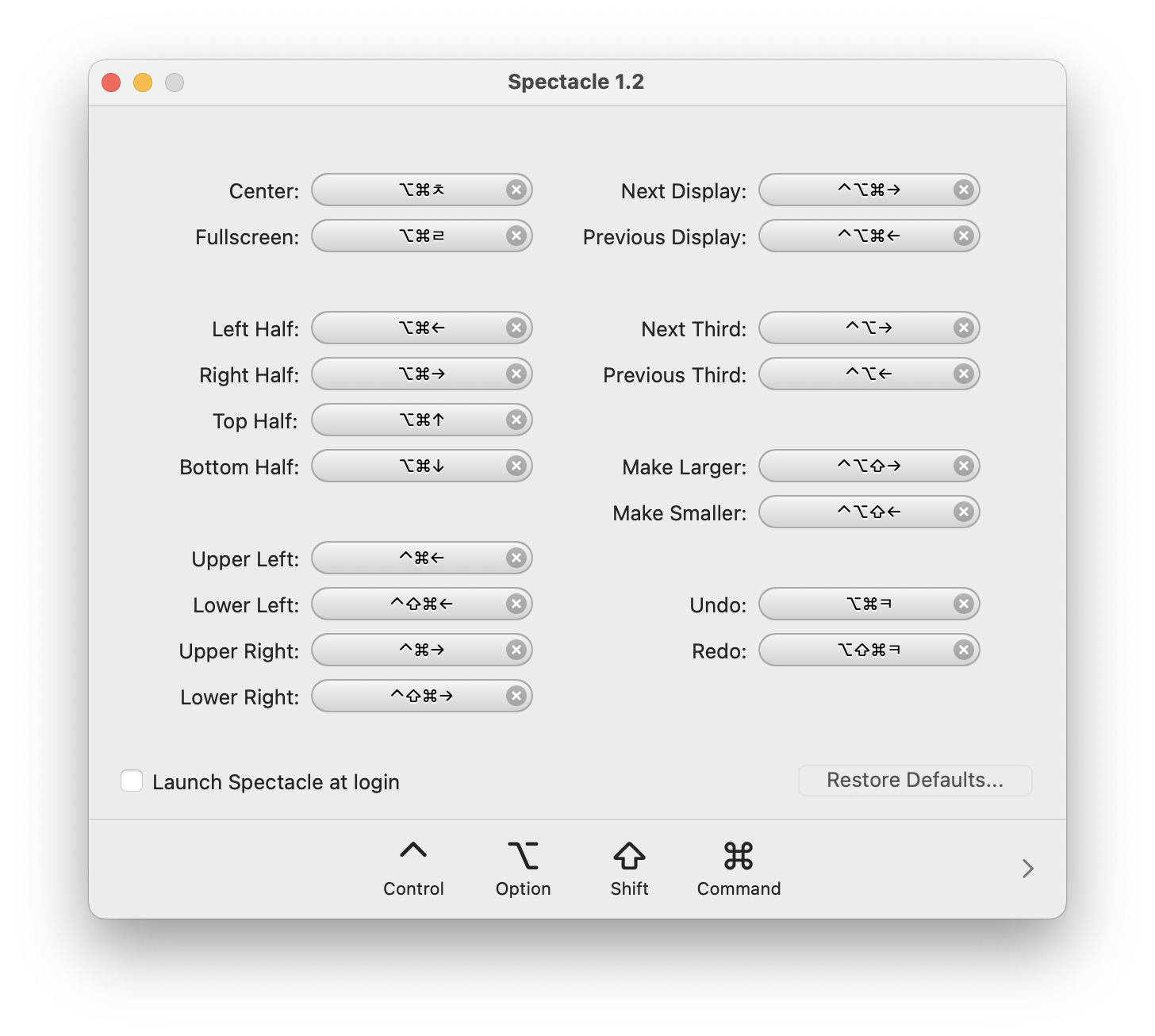 그러면 Spectacle 앱이 실행됩니다. 다양한 액션들의 단축키를 지정하거나 해제할 수 있습니다. 아래쪽에 있는 "Launch Spectacle at login" 항목을 선택하면 시스템이 재부팅될 때 자동을 실행됩니다.