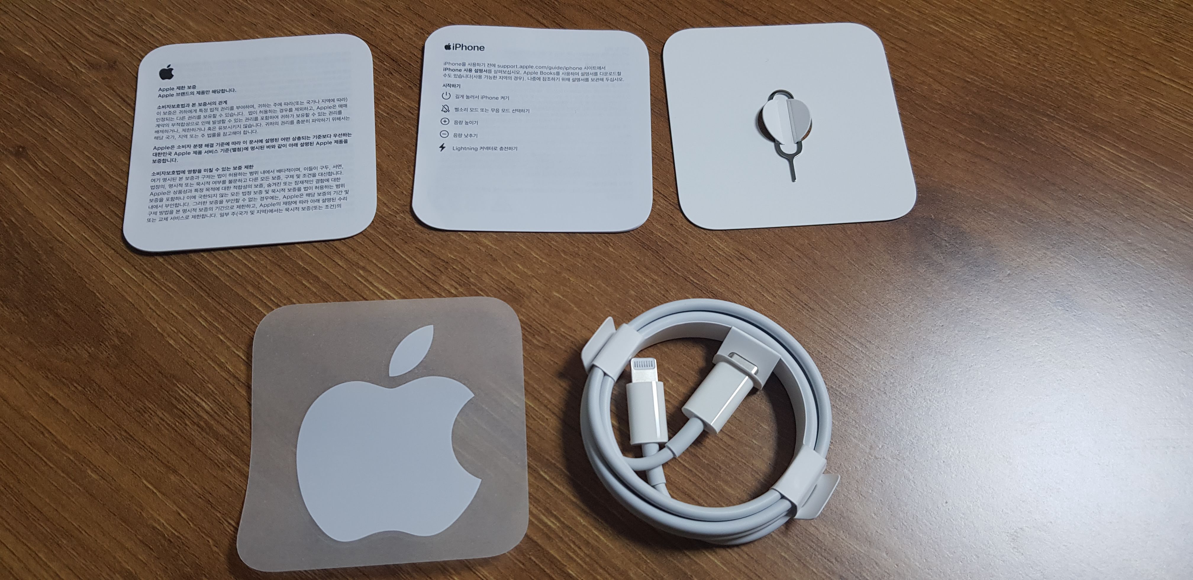 폰을 들어내면 심플해진 패키지 구성품들이 있습니다. 데이터 전송과 충전을 할 수 있는 USB-C to 라이트닝 케이블과 유심핀, 스티커와 정품 인증서가 들어있습니다. 잘 알려진대로 충전기가 없습니다.