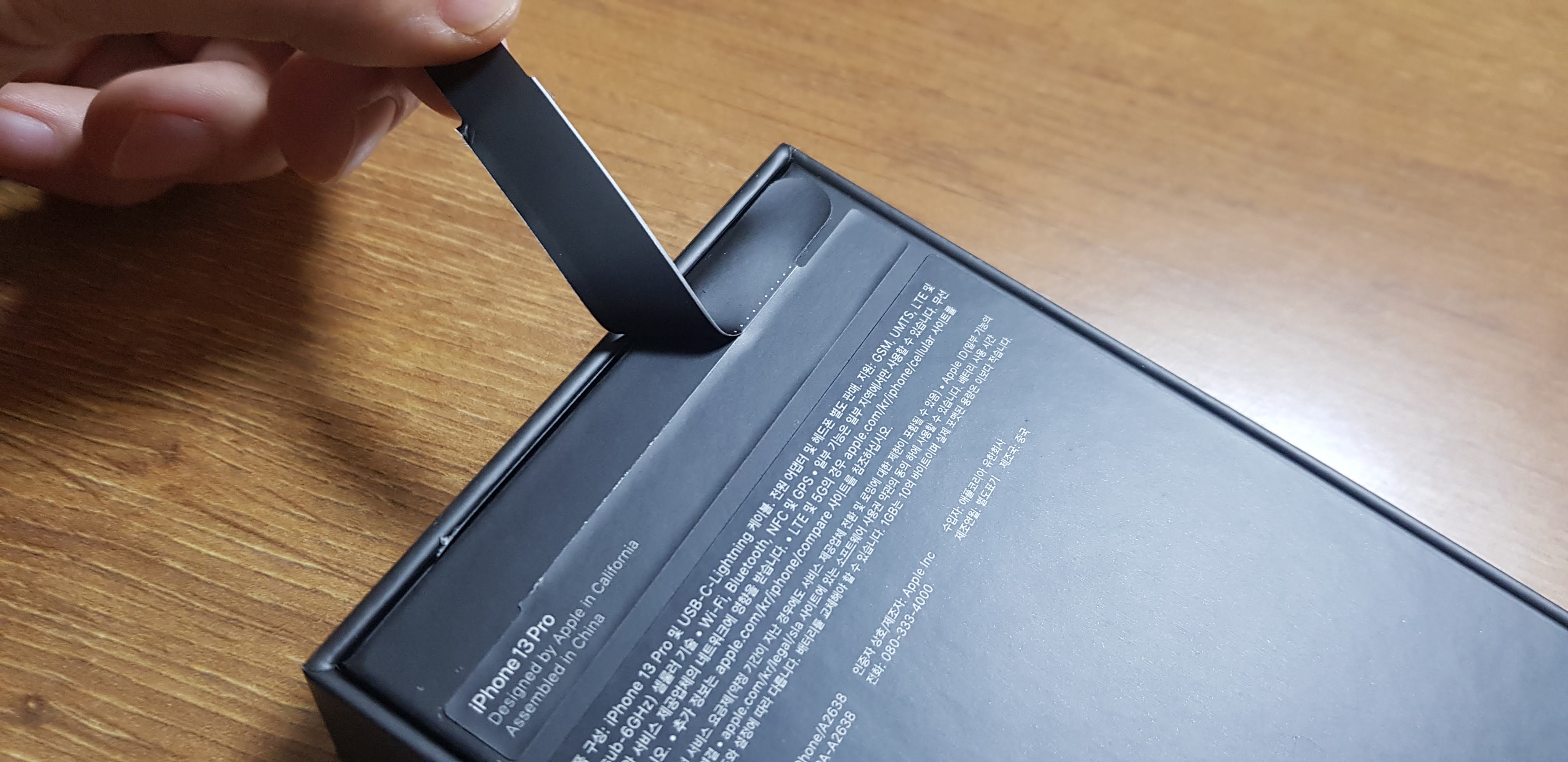 아이폰 13 프로의 패키지를 열면 폰의 후면이 상단으로 오도록 되어 있습니다. 아이폰 13 프로의 카툭튀가 어마어마한데요. 카툭튀를 커버하기 위해서 패키지의 덮개 부분에 홈이 파여져 있습니다.