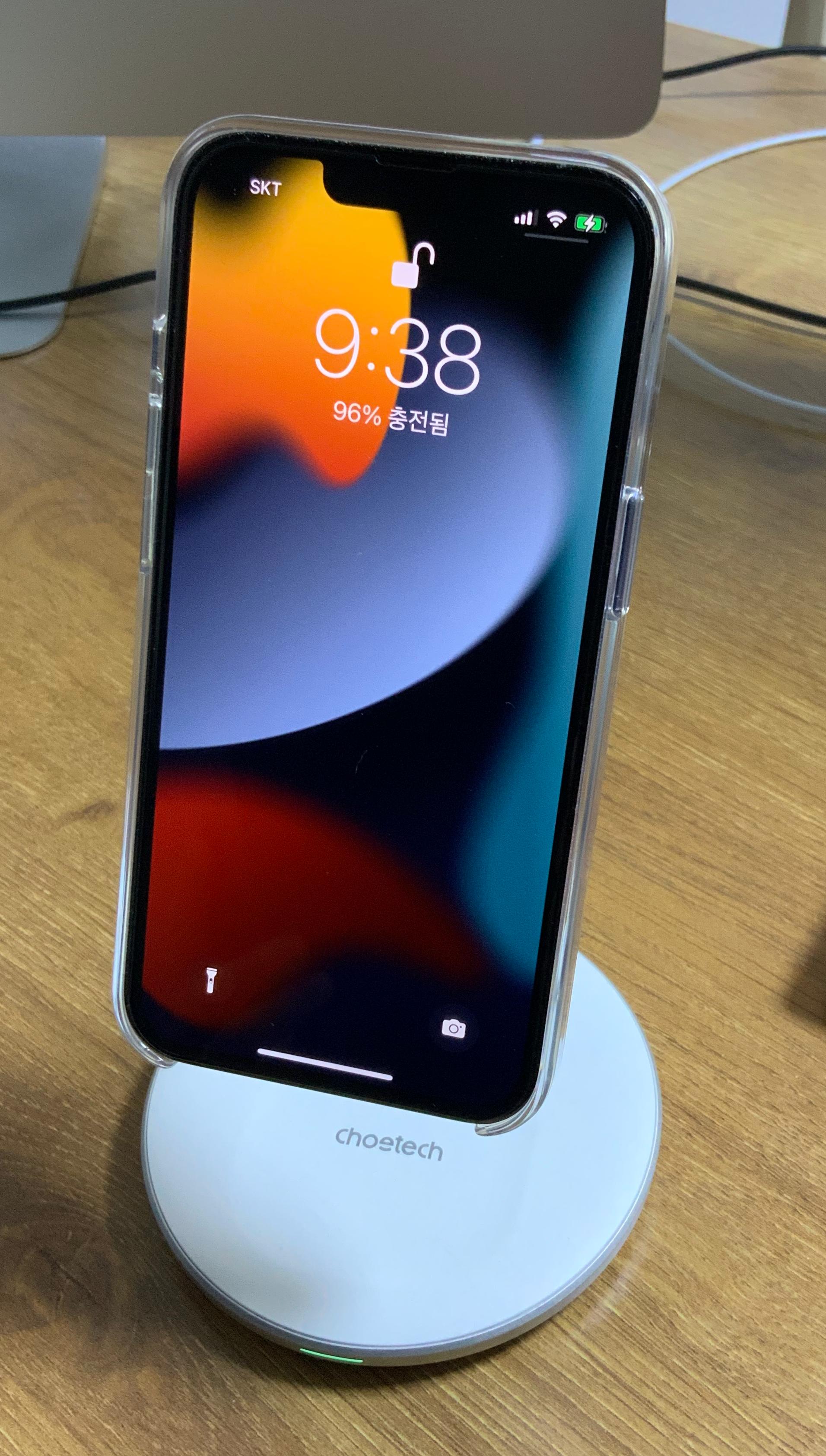 아이폰13프로를 초텍 2-in-1 충전기에 거치한 모습입니다. 충전중일 경우 하단에 있는 LED 표시등이 켜집니다. 충전이 완료되었을 경우 하단의 LED 표시등이 꺼집니다.