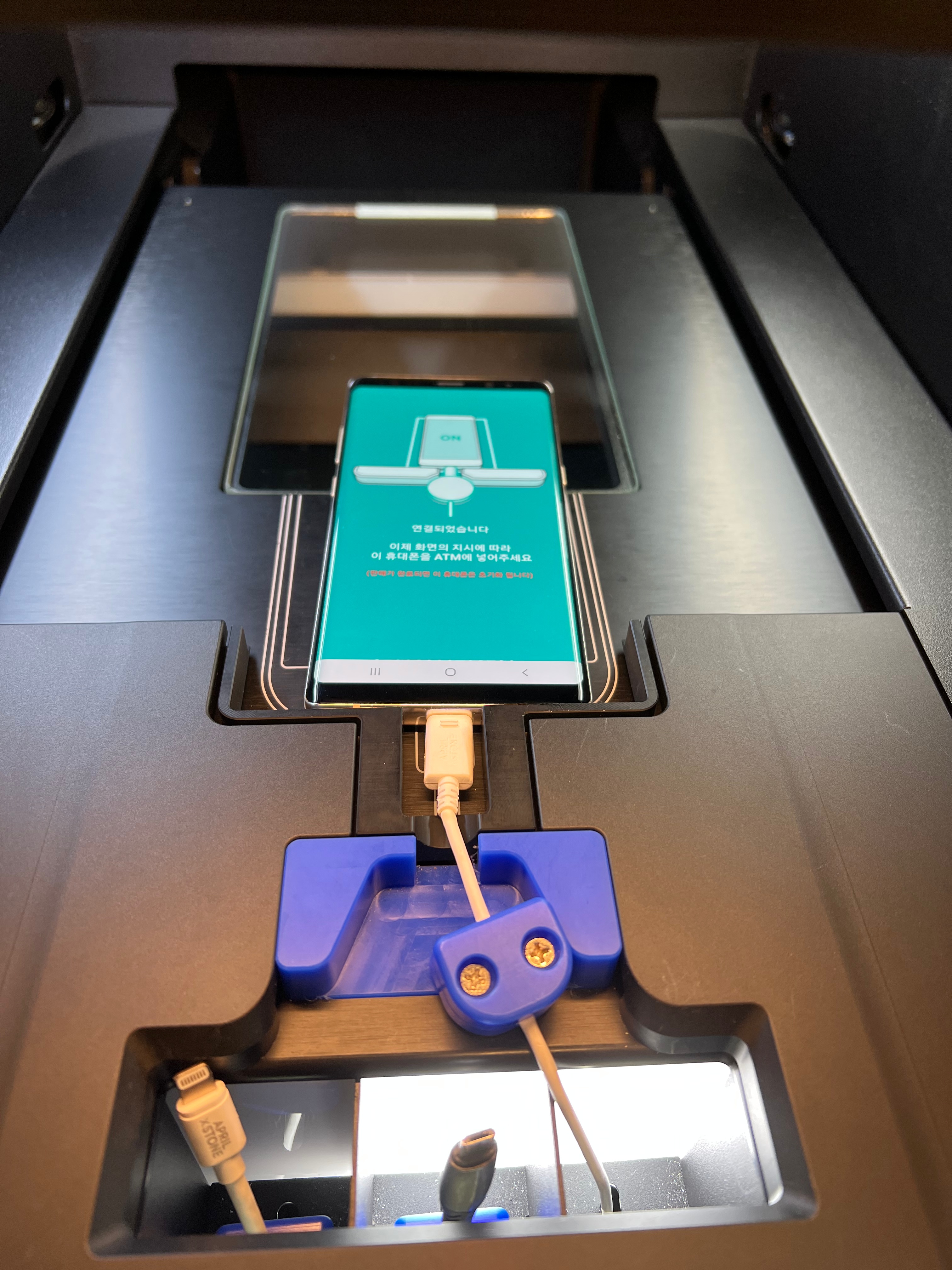 쭉 진행을 하면 덜컹하고 민팃 ATM 기기의 문이 열립니다. 이 곳에 있는 케이블을 스마트폰과 연결한 다음 앱이 시키는대로 잘 놓아 줍니다.