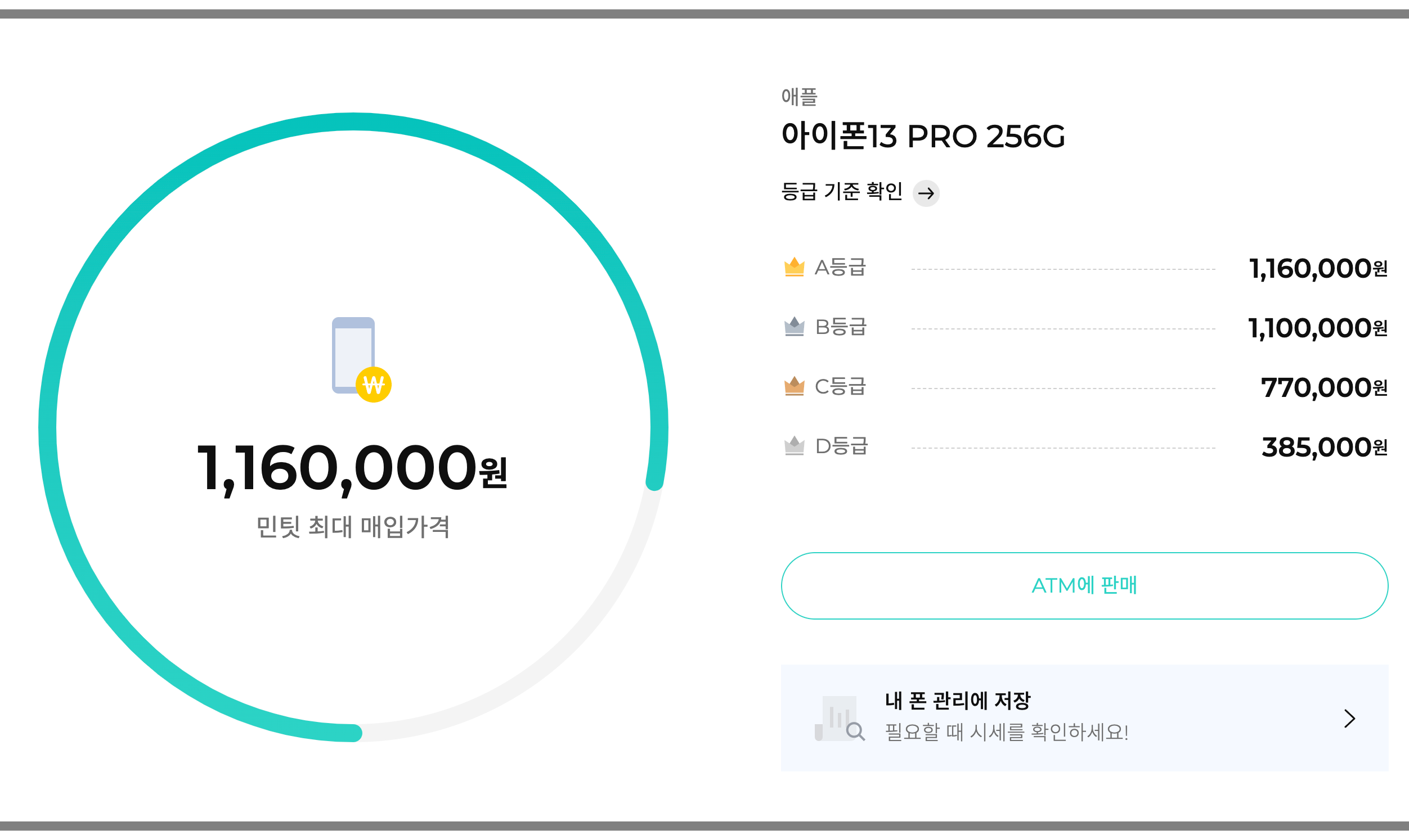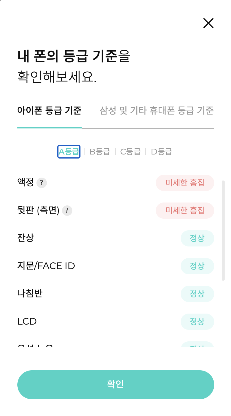 옵션들을 다 선택하면 등급에 따른 현재 시세를 알려줍니다. 실제 민팃 ATM 기기에서 기기 상태를 체크한 다음 등급에 따른 가격을 확정해줍니다.