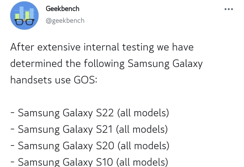 국내 커뮤니티의 한 유저가 테스트한 결과에서 GOS가 걸린 갤럭시 S22가 갤럭시 A52s보다 느린 것으로 나오기도 했습니다. (링크 : 여러종류 긱벤치 돌려봤습니다 - 뽐뿌) 물론 테스트 결과는 환경과 설정에 따라 다르게 나올 수 있긴합니다.