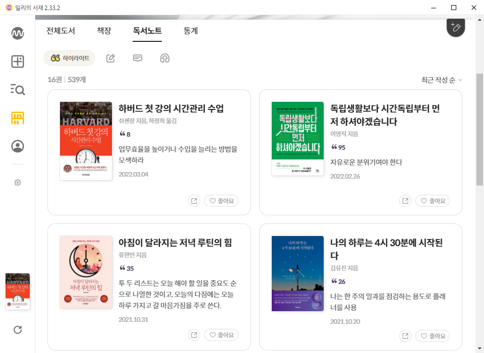 이제 스마트폰과 태블릿에서 작성한 밑줄과 메모를 PC 뷰어에서 확인해보겠습니다. 내 책장 메뉴로 들어가보면 읽은 책이나 읽고 있는 책들을 볼 수 있습니다. 독서노트의 하위 메뉴에는 '하이라이트', '포스트', '한줄리뷰', '3분리뷰'가 있습니다.