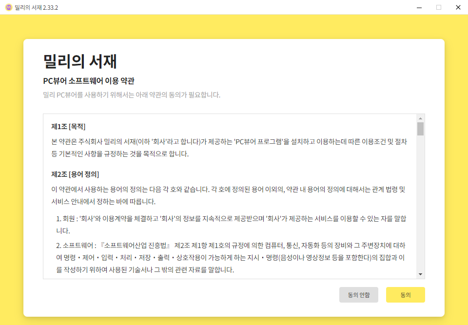 아무튼 PC에서 밀리의 서재 책 내용과 메모, 하이라이트를 보기 위해서는 PC 뷰어를 다운로드해서 설치해야합니다. 아 물론 밀리의 서재에 가입이 되어 있어야 읽었던 책들의 메모를 불러올 수 있습니다. 밀리의 서재에는 가입되어 있다고 가정하고 진행하겠습니다.