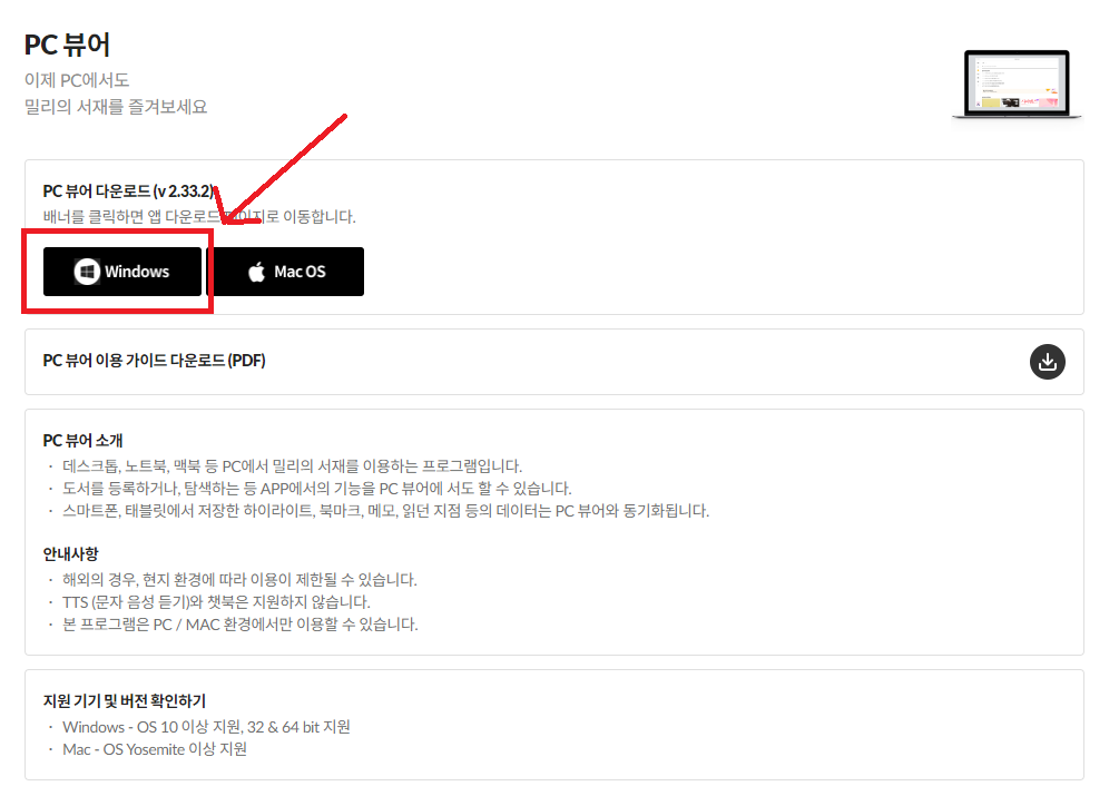 아무튼 PC에서 밀리의 서재 책 내용과 메모, 하이라이트를 보기 위해서는 PC 뷰어를 다운로드해서 설치해야합니다. 아 물론 밀리의 서재에 가입이 되어 있어야 읽었던 책들의 메모를 불러올 수 있습니다. 밀리의 서재에는 가입되어 있다고 가정하고 진행하겠습니다.