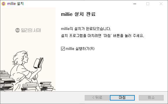 다운로드한 파일을 실행하면 바로 설치가 진행되고 완료됩니다. 마침을 눌러 밀리의 서재를 실행해줍니다.