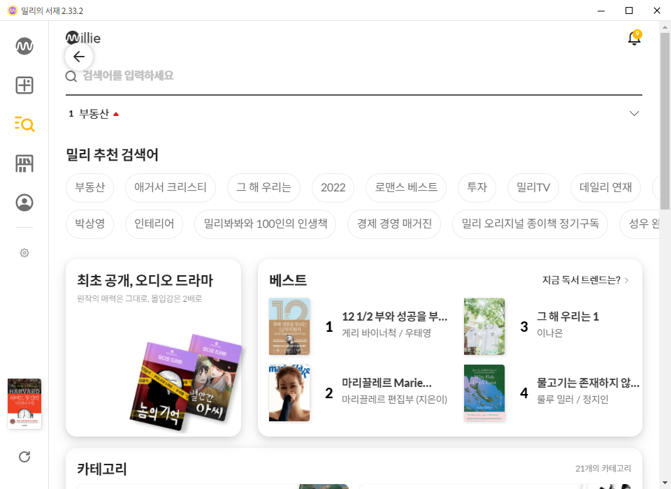 한달에 정해진 금액으로 마음껏 책을 읽을 수 있는 서비스인 '밀리의 서재'를 쓰고 있습니다. 밀리의 서재는 아이폰이나 안드로이드 스마트폰 그리고 아이패드나 안드로이드 태블릿에서 앱의 형태로 사용할 수 있는데요. 윈도우 PC에서도 책을 볼 수 있도록 밀리의 서재 PC 뷰어를 제공합니다.