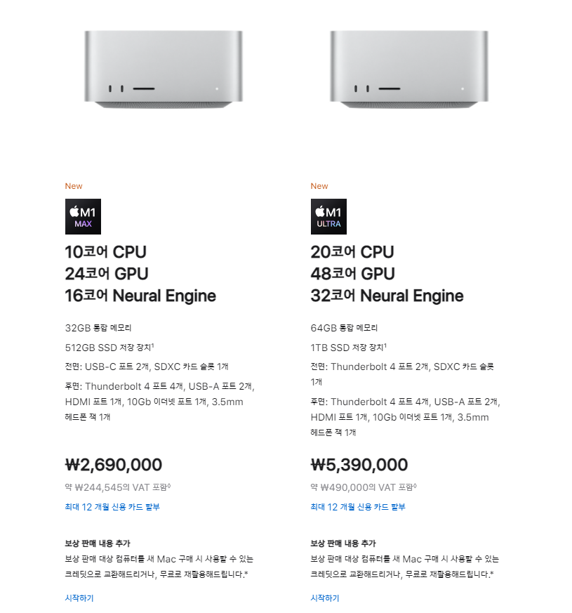 맥 스튜디오 M1 Max 모델은 269만원부터 시작합니다. M1 Ultra 모델은 더 비싸서 539만원부터 시작합니다. 후덜덜한 가격이네요. 물론 저정도 성능에 저정도 가격이면 가성비가 좋다고 할 수도 있습니다. 크리에이터라면 고성능이 필요할테니까요.