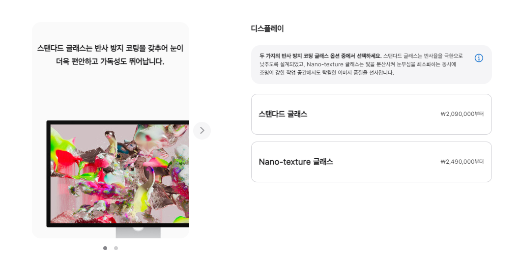 스튜디오 디스플레이는 209만원부터 시작합니다. 반사를 줄여주는 Nano-texture 글래스의 경우 40만원 더 비싸고요. 여기에 높이 조절 옵션이 붙으면 60만원이 더 비싸집니다.