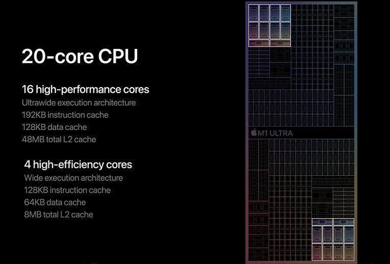 M1 Ultra 칩의 CPU 연산 성능은 산술적으로 M1 맥스의 두배 정도입니다. 고성능 코어 16개를 넣고 저전력 코어 4개가 들어갔는데요. 고성능 코어를 넣어도 전력 사용이 폭발하지 않는다는 자신감의 표현인 것 같습니다.