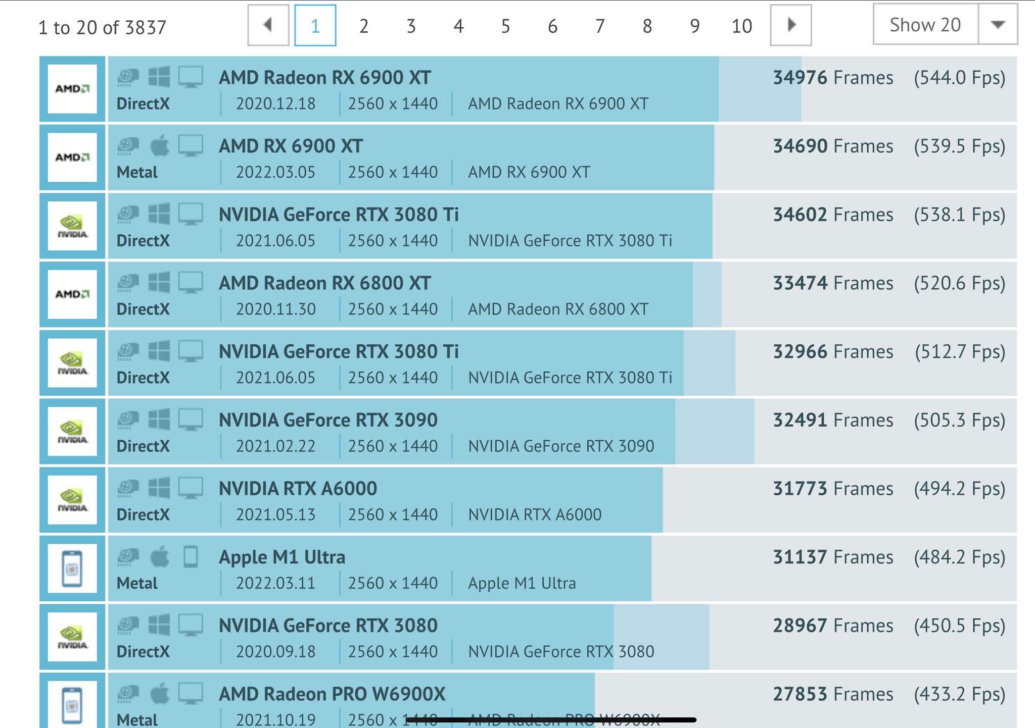 하지만 The Verge가 긱벤치5 그래픽 테스트를 사용해서 M1 Ultra와 NVIDIA RTX 3090을 비교한 결과 RTX3090 칩을 풀파워로 돌렸을 경우에는 압도적으로 NVIDIA 칩의 성능이 높았습니다. (출처 : M1 Ultra Doesn't Beat Out Nvidia's RTX 3090 Despite Apple's Chars - MacRumors)