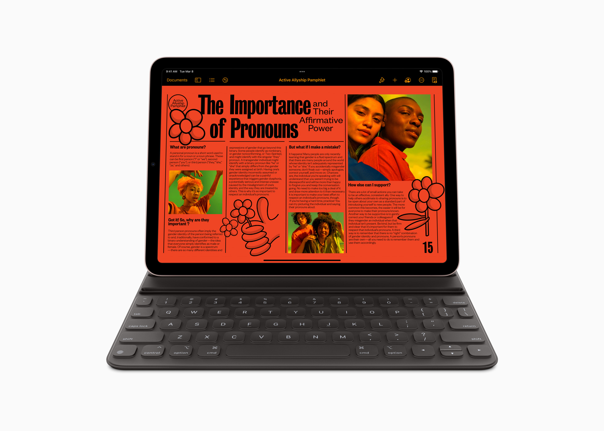 애플 펜슬 2세대를 지원해 스케치나 메모 기능을 사용할 수 있습니다. 아마 애플 펜슬이 가장 많이 사용되는 액세서리가 아닐까 생각됩니다. 그 밖에 매직키보드(Magic Keyboard), 스마트 키보드 폴리오(Smart Keyboard Folio) 그리고 블랙, 화이트, 일렉트릭 오렌지, 다크 체리, 잉글리시 라벤더, 마린 블루 색의 스마트 폴리오 커버와도 호환됩니다.