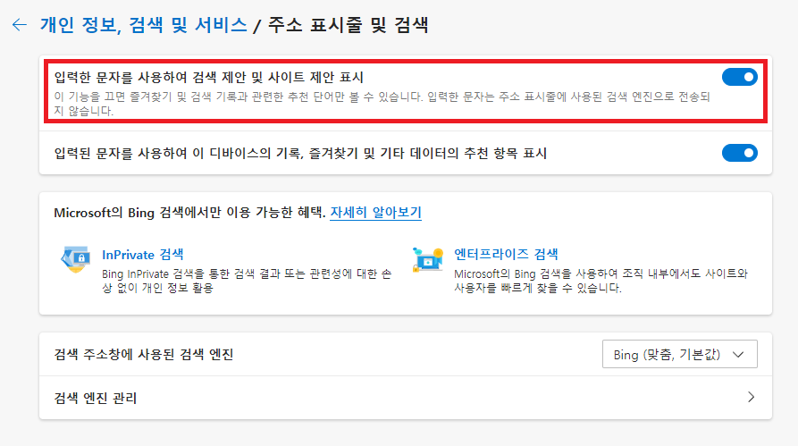 '설정' - '개인 정보, 검색 및 서비스' - '주소 표시줄 및 검색'에 들어가면 "입력한 문자를 사용하여 검색 제안 및 사이트 제안 표시" 항목이 있습니다.