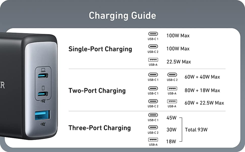 USB-C 포트를 단독으로 사용할 경우 100W 출력을 냅니다. 맥북 프로를 빠르게 충전하고 싶은 경우 충전 포트 하나만 사용하면 됩니다. USB-A 포트는 단독으로 사용할 경우 22.5W 출력을 냅니다.