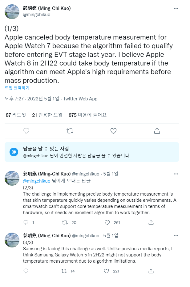 밍치궈의 트윗에 의하면 원래 작년 출시된 애플워치 시리즈7에 탑재될 예정이었던 체온측정 기능은 출시전 EVT(Engineering Validation Testing) 단계에 들어가기 전에 충분한 알고리즘 수준에 도달하지 못해 탑재가 튀소되었다고 합니다.