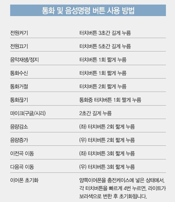 양쪽 이어버즈에는 터치 패드가 장착되어 있습니다. 터치패드를 이용해서 음량조절이나 통화수신, 이전곡과 다음곡 선택등을 컨트롤 할 수 있습니다.