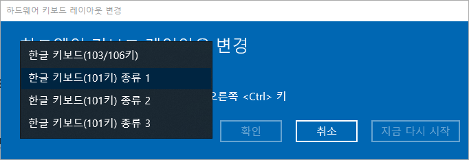 한글 키보드 101키는 3가지 종류가 있으며 한/영 전환과 한자 선택에 사용하기 편한 종류로 선택하면 됩니다.