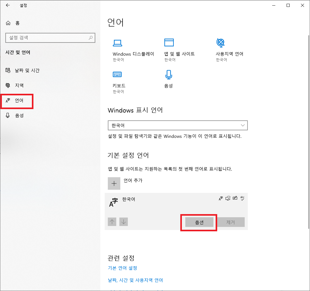 1. Windows 설정에서 시간 및 언어 항목으로 들어갑니다.