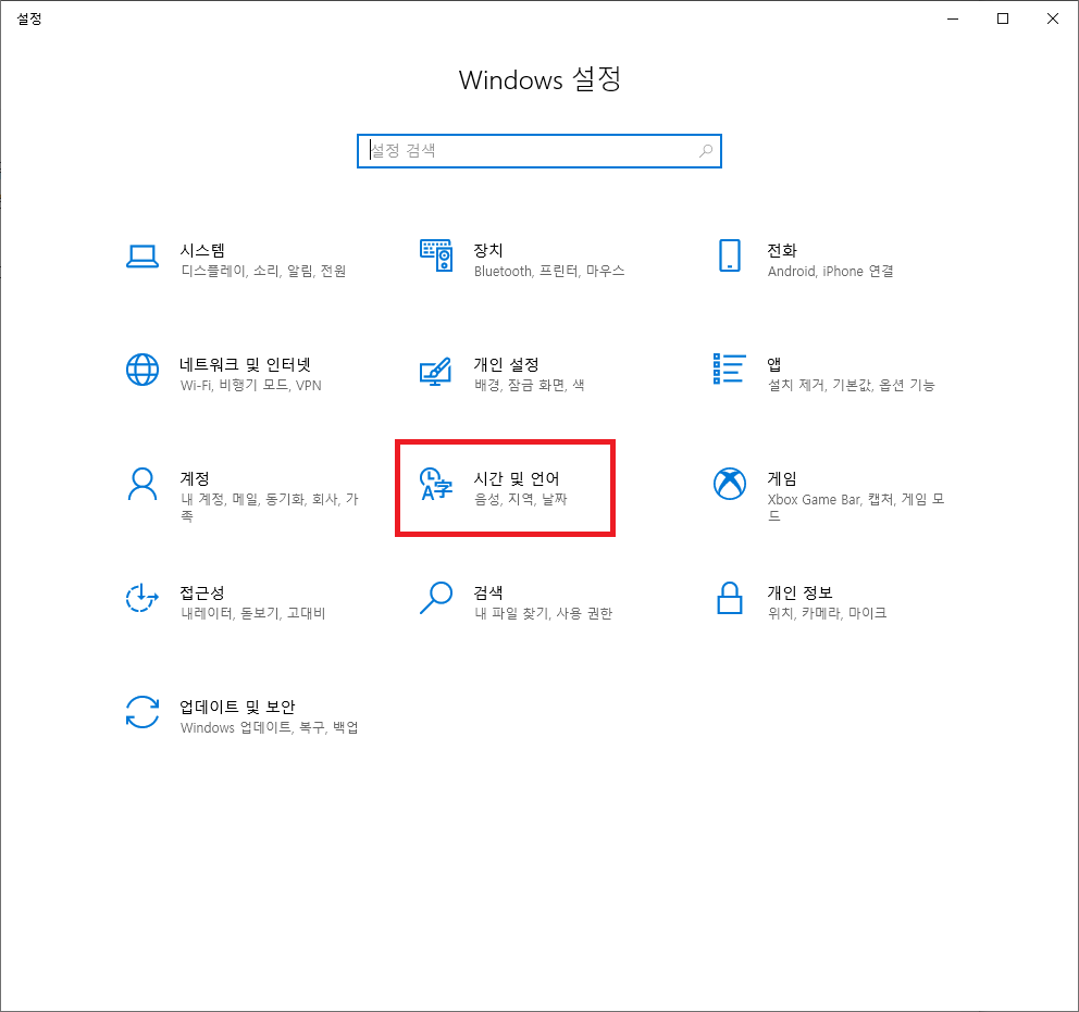 1. Windows 설정에서 시간 및 언어 항목으로 들어갑니다.