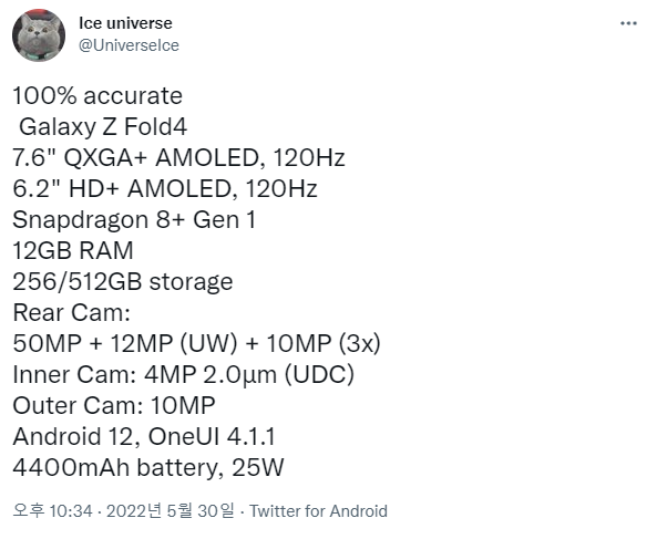 IT 트위터리안 'ice universe'가 올 가을 출시될 삼성전자의 '갤럭시 Z 폴드 4'의 스펙 정보와 디자인에 대한 언급을 했습니다.