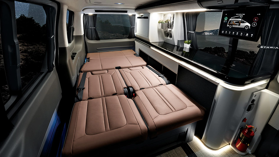 스타리아 라운지 캠퍼의 내부에는 전동으로 시트 각도 조절이 가능한 2열 풀 플랫 시트가 탑재되어 있어 취침 공간을 만들 수도 있습니다.