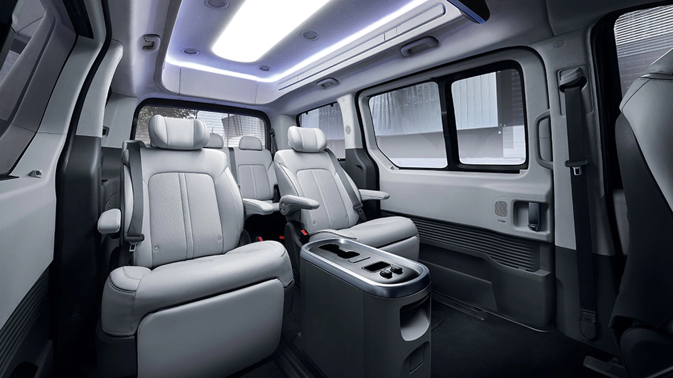 라운지 리무진의 실내는 기본 트림보다 205mm 늘어난 전고와 함께 1열에서 2~3열까지 이동 가능한 무버블 콘솔을 적용해서 공간 활용성을 극대화 했습니다. 라운지 리무진이다보니 내부를 매우 넓게 사용할 수 있습니다. 무버블 콘솔에는 팝업식 테이블과 컵홀더, USB-C 타입 충전 기능이 포함되어 있습니다.