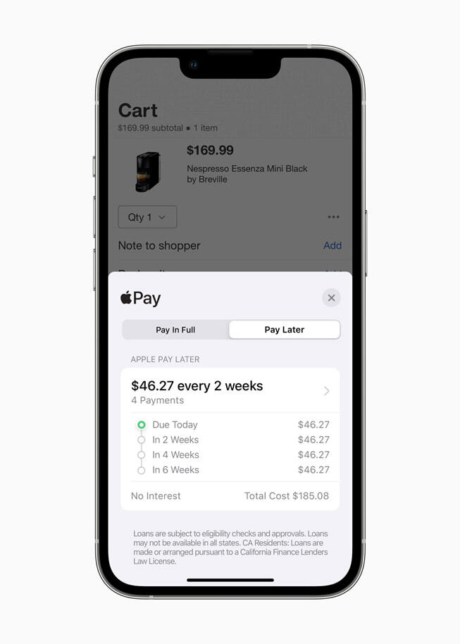 애플은 Apple Pay Later를 통해 미국 사용자가 애플 페이 구매 대금을 6주에 걸쳐 4회 분납하는 방법을 제공하기 시작했습니다. 이 결제 방법은 무이자이며 수수료도 없습니다. 사용자는 Apple Pay Order Tracking 기능을 통해 이 기능에 참여한 판매자로부터 애플 페이로 구매한 내역에 관한 상세한 영수증 및 주문 추적 정보를 지갑 앱에서 조회할 수 있습니다.