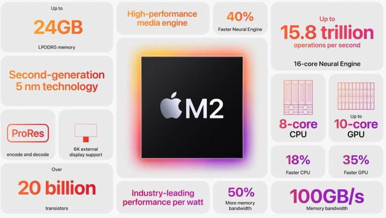 M2 칩은 5나노미터 공정의 8코어 CPU(4 고성능 + 4 고효율)입니다. 전작인 M1 칩에 비해 18% CPU 성능 향상이 있었고, 10코어 GPU 적용으로 35% GPU 성능 향상, 40% 더 빠른 뉴럴엔진이 적용되었습니다.