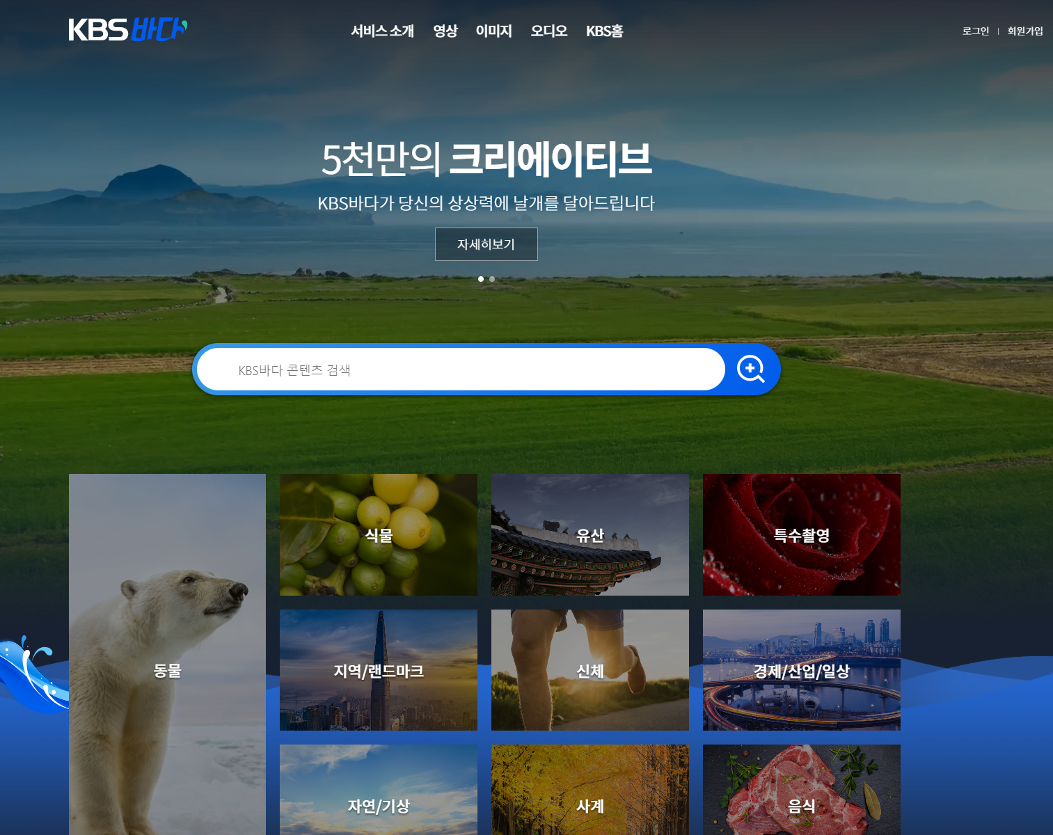 KBS 바다에는 총 6300개 이상의 영상클립과 5300개 이상의 이미지와 오디오 데이터들이 있습니다. 동물과 식물, 헤리티지, 한국의 풍경과 랜드마크 등 다양한 소재의 자료들을 검색한 다음 사용할 수 있습니다.