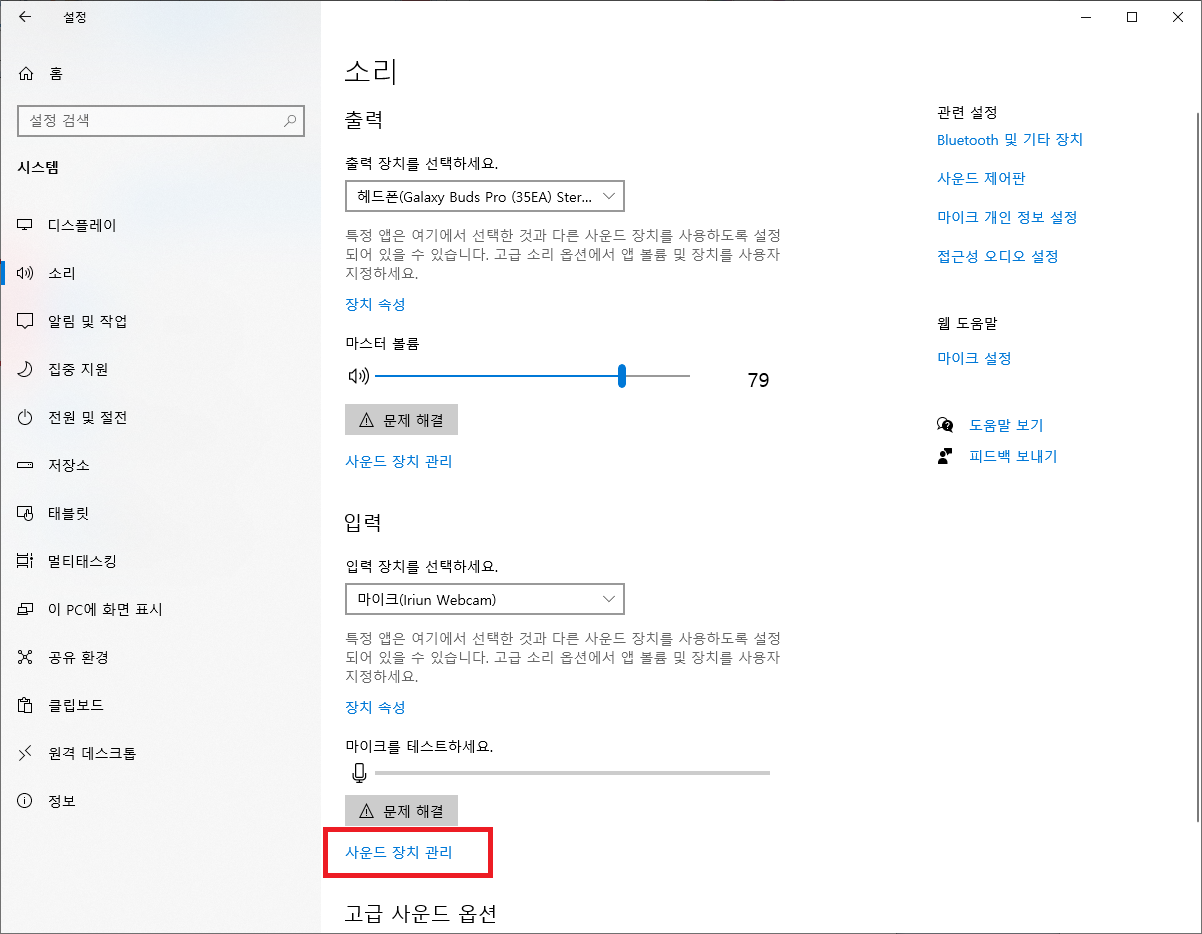 시스템 항목 중 '소리' 항목을 선택한 후 아래쪽에 '사운드 장치 관리'를 선택해줍니다.
