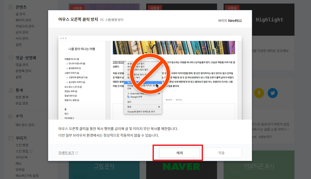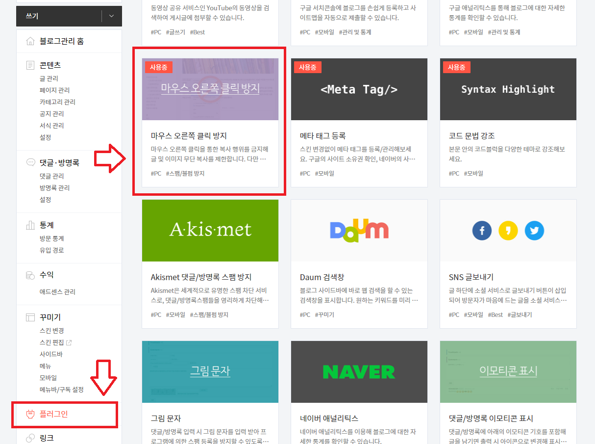 일단 티스토리에서 제공하는 '마우스 오른쪽 클릭 방지' 플러그인을 해제해야합니다. 티스토리의 관리모드에서 플러그인 메뉴를 선택하면 '마우스 오른쪽 클릭방지' 플러그인이 있습니다.