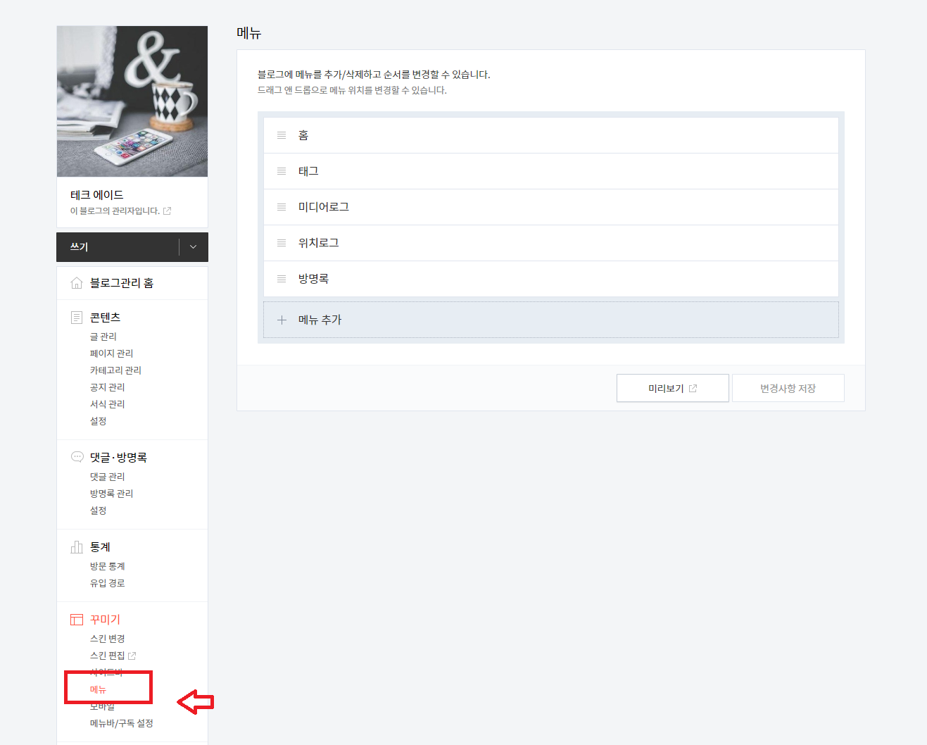 태그나 미디어로그, 위치로그 같은 메뉴는 기본으로 설정되어 있기는 하지만 잘 사용되지 않습니다. 따라서 깔끔하게 지워버리고 원하는 메뉴를 추가하도록 하겠습니다.