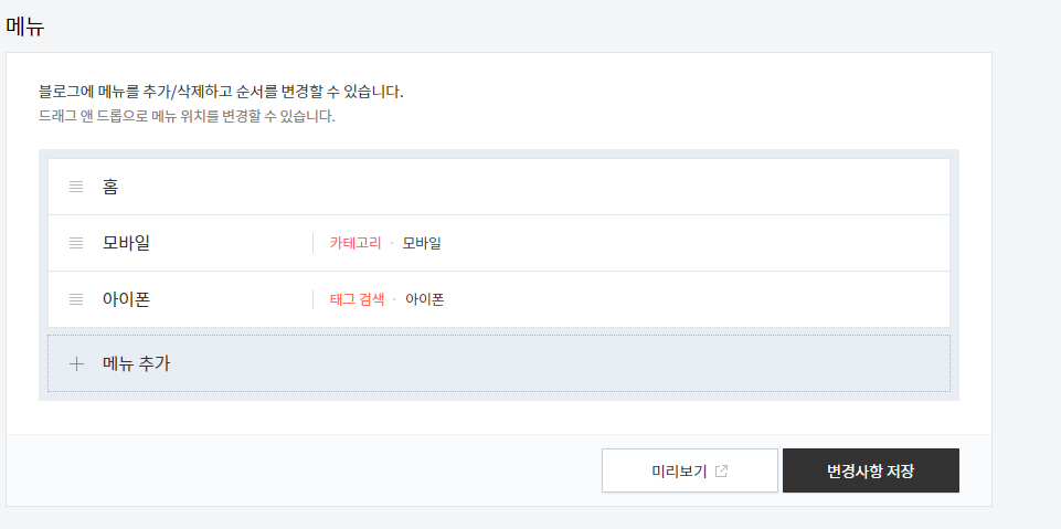 - 카테고리 : 블로그에 만들어진 카테고리를 메뉴로 추가할 수 있음