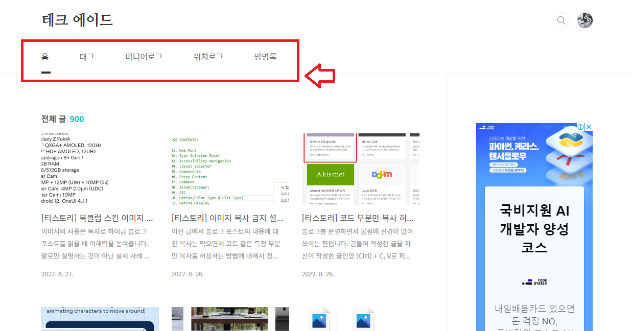 - 기본 메뉴 : 홈, 태그, 방명록 같은 블로그에서 제공하는 기본 기능