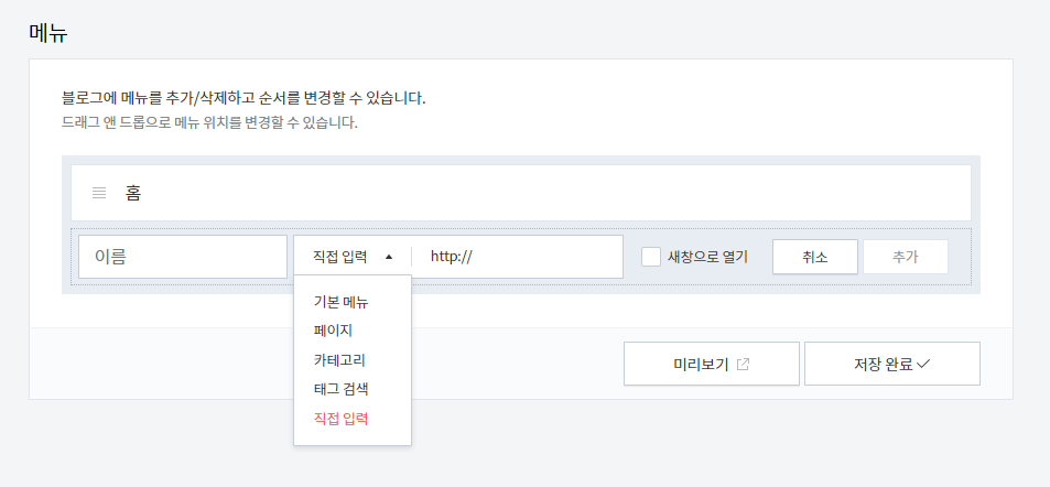 - 직접 입력 : 티스토리와 관련없는 다른 외부 링크를 메뉴로 추가할 수 있음. 개인 SNS나 링크드인 프로필 같은 것을 추가하면 좋음