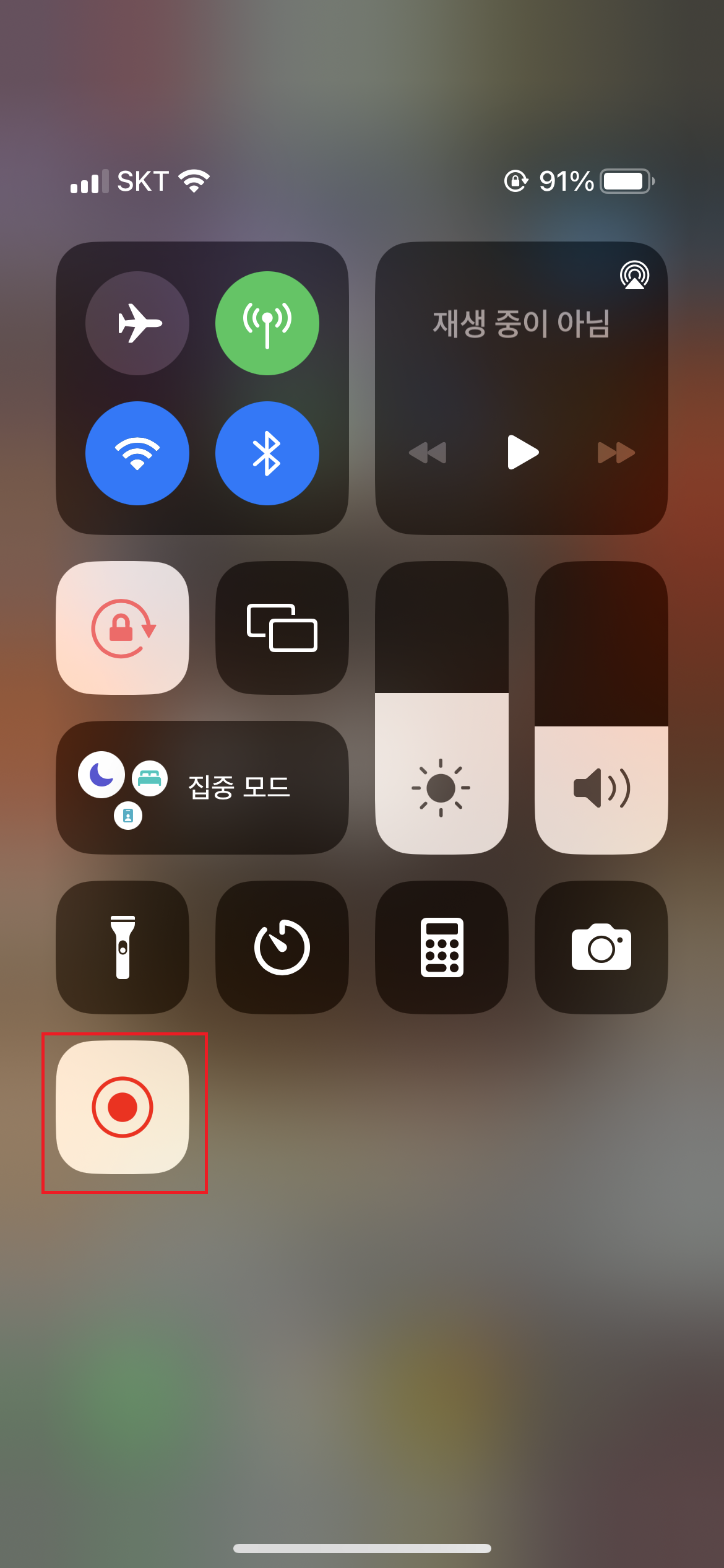 이제 아이폰 오른쪽 상단을 쓸어 내려 제어센터를 열어보면 전에는 보이지 않던 아이콘이 하나 보입니다. 아까 화면 기록 항목에서 봤던 아이콘 모양이 제어센터에 나타났습니다.
