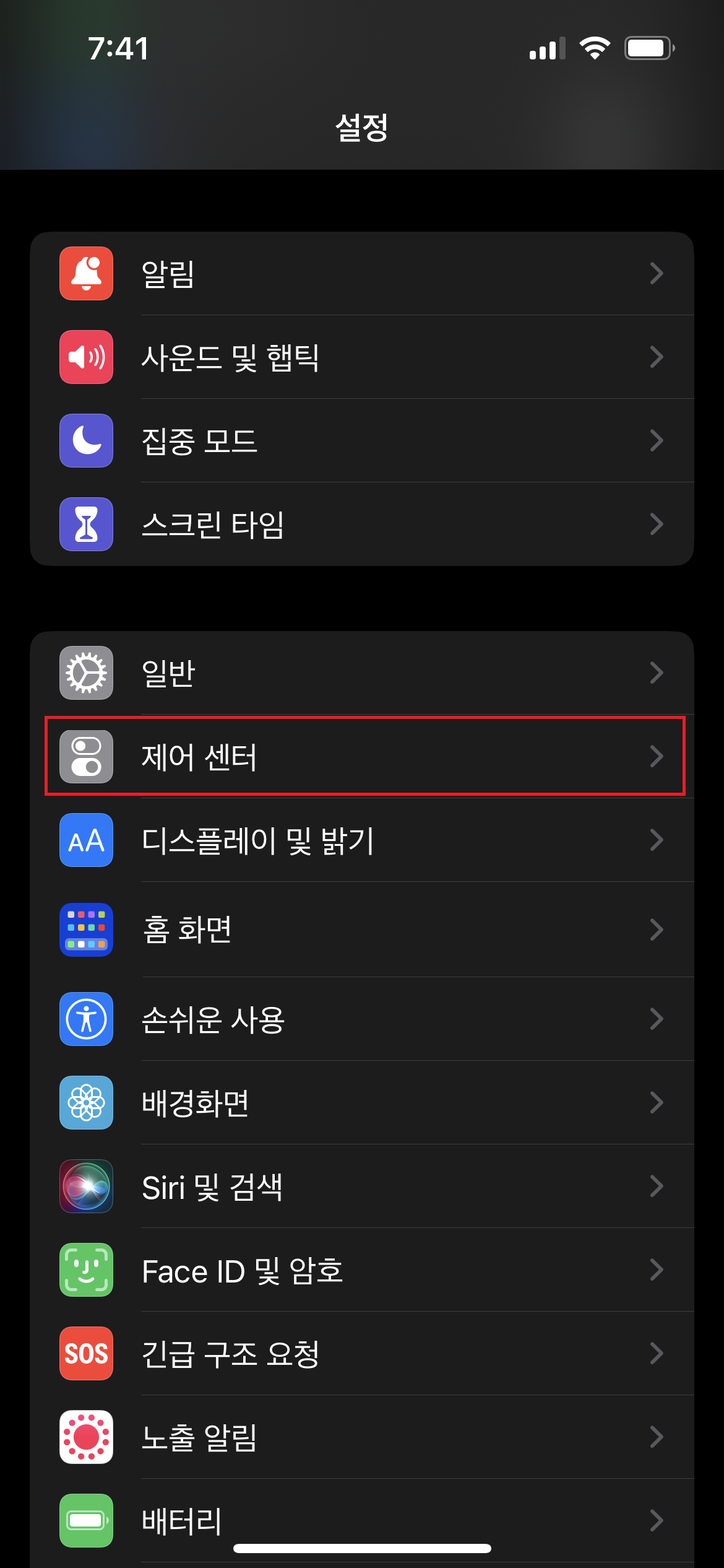 아이폰의 제어센터에서 화면 녹화 기능을 사용할 수 있도록 추가해보겠습니다. 설정 앱으로 들어갑니다. 그리고 제어센터 항목을 찾아 들어갑니다.