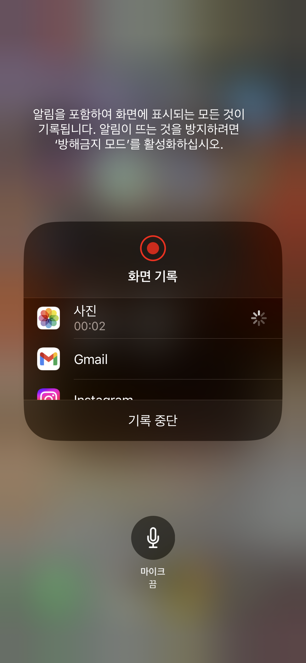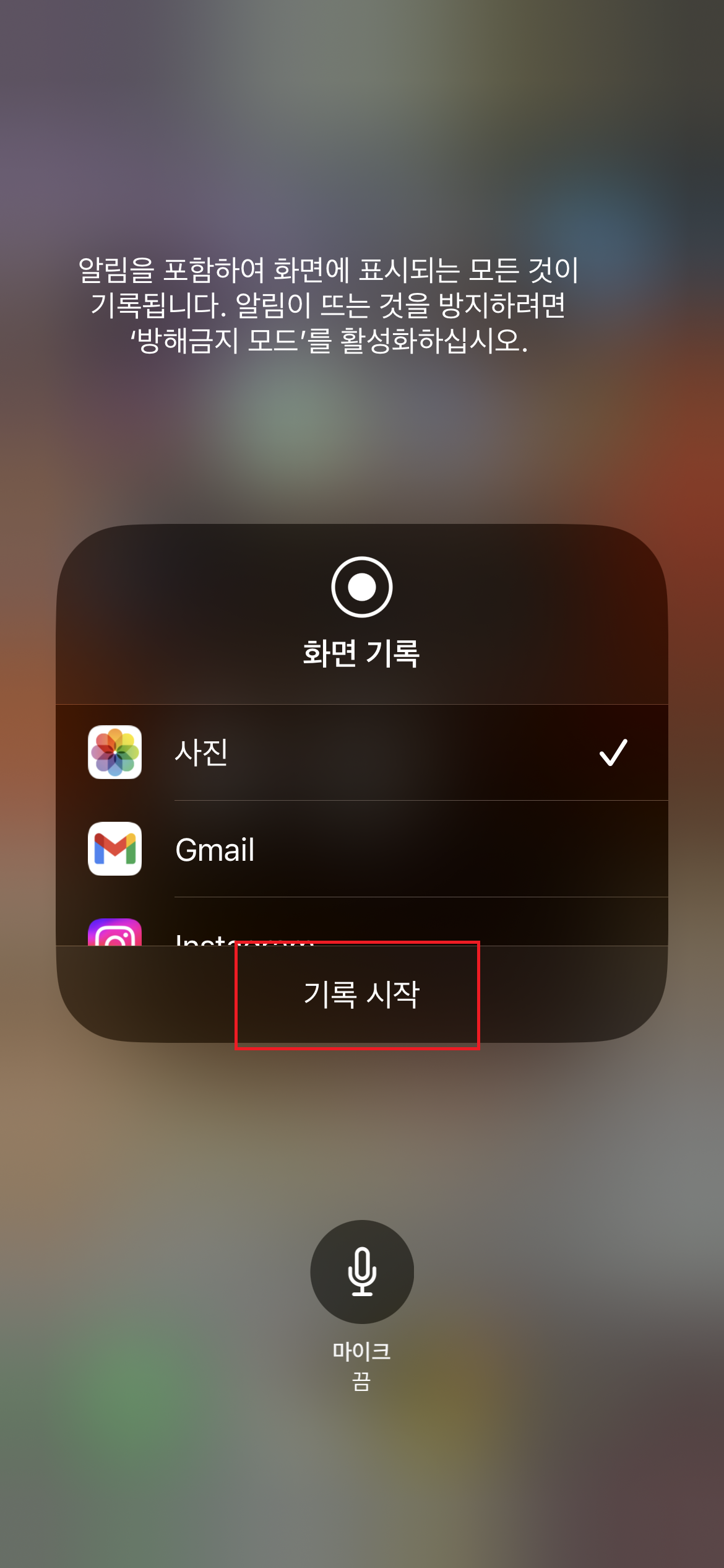 화면기록 버튼을 길게 누르면 상세 옵션을 선택할 수 있습니다. 하단에 마이크 버튼을 눌러서 아이폰의 마이크로 외부 음성을 함께 기록하거나 기록하지 않게 할 수 있습니다.