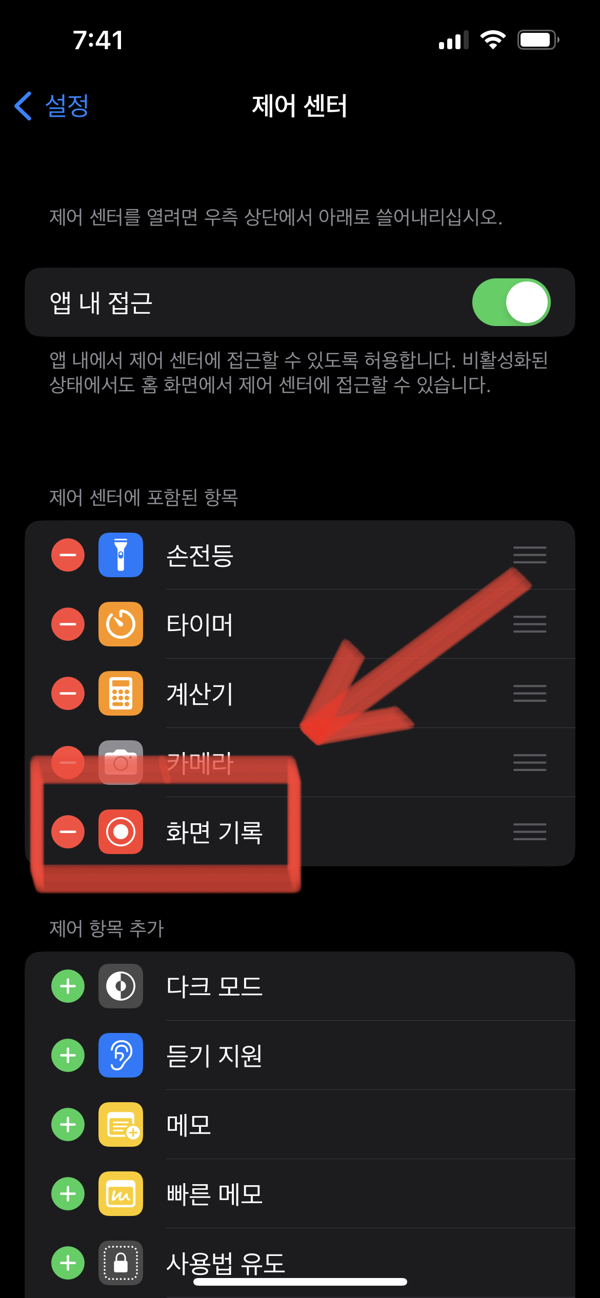 그러면 제어센터에 추가되었거나 추가할 수 있는 항목들의 리스트가 나옵니다. 아래로 내려보면 '화면기록'이라는 항목이 있습니다. 화면 기록 옆에 있는 녹색 + 버튼을 눌러서 제어센터에 화면기록을 추가해줍니다.